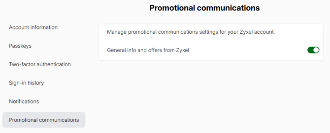 Click the General info and offers from Zyxel switch to the right to receive emails containing general information and promotional offers from Zyxel.