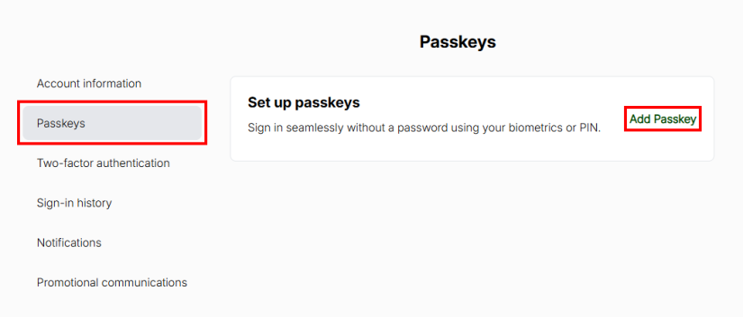 To set up passkey and sign in using your PIN or biometrics, do the following: