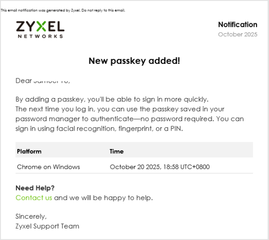 6 A New passkey added! email will be sent to the same email address used for your Zyxel Account.