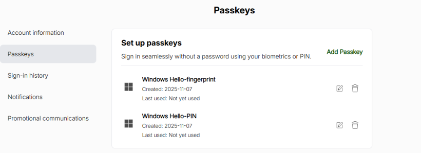 7 You can view all your saved passkeys on the Manage account > Passkeys page. Select the passkey that matches the device you are using to sign in.