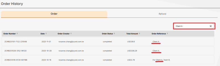 You can search for an order using a keyword to find a specific one. For example, use the date you placed the order, the email of the order creator, or part of the order number. You can also use the